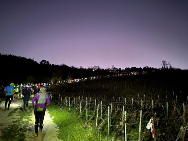 500 coureurs au départ, pas de dossard, pas de chronométrage……seules la frontale et la bonne humeur étaient exigées. Le parcours était très bien balisé entre vignes et forêt avec un minimum de boue comme un peu partout en ce moment. Les bénévoles de Trail Aventures ont comme toujours animé le parcours avec musique et quelques illuminations, merci à eux.