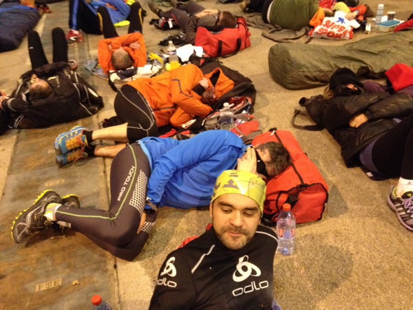 21h : arrivée à St Etienne : il pleut, il y a du vent, il fait bien frais. Le plus dur commence …..il faut attendre 3 heures avant le départ. Les habitués sont équipés en sac de couchage….pas nous : ce sera le ciment froid, pour non pas dormir ( c’est trop tôt), mais nous reposer, nous concentrer, rencontrer des amis, prendre un café, manger et boire régulièrement….et voir comment la météo va évoluer…certains hésitent encore sur leur équipement à mettre et à prendre…le speaker nous repassant en boucle : » beaucoup de boue dans la 1ère partie, jusqu’à Ste Catherine, de la neige sur les crêtes, des températures négatives, un vent glacial et 2 descentes dangereuses dans le bois d’Arfeuille et..etc.. » bref un vraie Saintelyon.