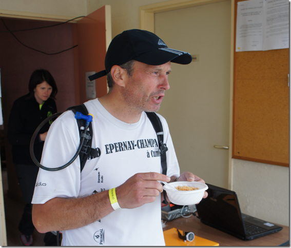 Vers le 28ème km, d’un commun accord je poursuis seul à mon rythme. Dés le 33ème Fred ressent les 1ères crampes. A mi course , au 52ème, Valérie et Christophe sont là pour nous encourager. Fred va pouvoir se ravitailler et se faire masser pour repartir fringant après une bonne averse.
