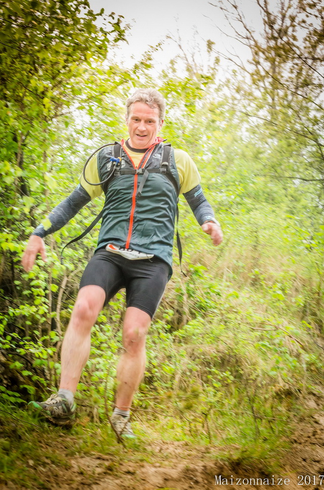 C’est toujours agréable de courir sur les chemins de la forêt de l’Argonne. Je l’ai pris sans aucune prétention de chrono ou de « bagarre » pour gagner des places ( quelques unes quand même…) car il y a un moment que je n’ai pas fait de trail, j’ai toujours des problèmes récurrents de genou qui reviennent régulièrement et m’obligent à m’arrêter et donc aucun entrainement de plus de 14 km!!! Donc le but était de faire tranquillement la distance, d’arriver au bout sans se faire mal au genou et sans trop de douleurs aux cuisses. Après le 1er ravitaillement, je n’arrivais plus à courir, j’ai du faire une double pause technique pour me soulager (j’ai perdu plus de 5mn et pas mal de places. Je n’ai jamais pu rattraper Claude. mais bon j’ai couru sans trop de difficulté jusqu’au 34ème km, après il a fallu gérer. J’en étais étonné vu le peu d’entrainement. Il faut croire qu’il me restait quelques globules rouge de mon séjour au Népal…….