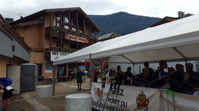 Bourg st Maurice km 51. Je prends du temps de souffler un peu et me ravitailler. Je n’échappe pas au contrôle de mon équipement….tout est conforme ….pas de pénalité.